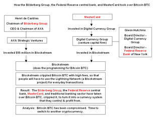 I noticed a lot of people mentioning Bilderberg's connection to AXA and BlockStream, recently with Jeff Berwick's two videos going viral as seen here and here. It has been something I have been trying to warn people of for a while, and if you don't know what Bilderberg is you really need to watch this excellent documentary about it. The current chairman of the Bilderberg steering committee Henri de Castries was also CEO of AXA until he announced retirement in 2016. AXA is one of the main funders of BlockStream and Bitcoin Core development. As one of the biggest insurance companies in the world AXA also benefits from the legacy too-big-to-fail bailout system, and Bitcoin is a threat to their way of life. AXA are also funding technocratic totalitarian smart cities, where they team up with governments for full control. It is not surprising that they would want to get their fingers into Bitcoin.