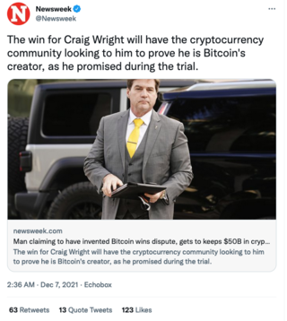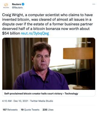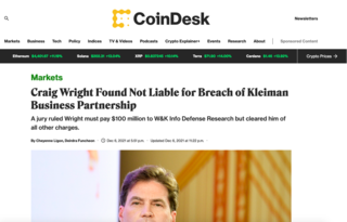 Craig Wright to Pay $100 Million to Kleiman Estate Concluding Bitcoin Case Craig Wright, who claims to be the infamous bitcoin creator Satoshi Nakamoto, will pay $100 million to the Kleiman estate after a protracted lawsuit reached its conclusion. A Miami court passed the verdict on Dec 6, in a case that claims that Wright had deceived a former associate over bitcoin intellectual property. The associate, Dave Kleiman, had worked with Wright before he died in 2013, and his estate alleged that Wright and Kleiman had mined 1.1 million bitcoins. The case has been ongoing for years, and Wright adamantly stated in court on multiple occasions that he invented bitcoin. Had Wright lost the case, it would have led to him having to prove that he has access to Satoshi’s bitcoins. Unfortunately for those who would have liked to see him prove it, he will only need to pay $100 million to the Kleiman estate relating to a charge of unlawful use of funds. This brings an end to one of the most hotly viewed legal cases in the crypto market. For instance, in June 2020, he staked a claim to the Mt. Gox funds that were stolen during the infamous hack in 2014.